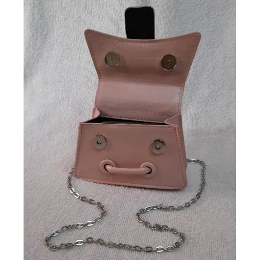 Сумочка кольору пудри. Одне відділення. Застібка дві магнітні кнопки. Маленька ручка та ланцюжок з металу срібного кольору, яка дозволяє носити сумочку на плечі